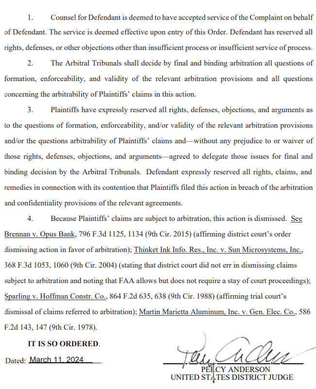 TEA has learned that U.S. District Court Judge Percy Anderson signed an order dated March 11 dismissing the case, noting that because the claims are subject to arbitration, the case has been dismissed. From the court filing: